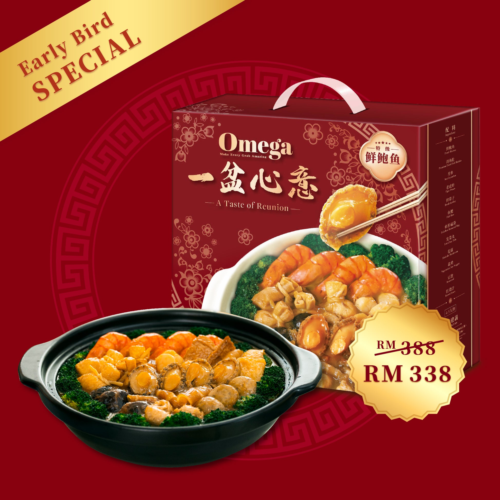 Celebrate any occasion with Omega Merchandise - Premium Abalone Poon Choy, a luxurious one-pot feast layered with premium ingredients and rich, savory flavors. Each pot is filled with tender seafood, heritage ingredients and our signature braised sauce — slow-cooked to perfection for deep, comforting taste in every bite. Perfect for family gatherings, festive celebrations, or sharing a hearty meal with loved ones.